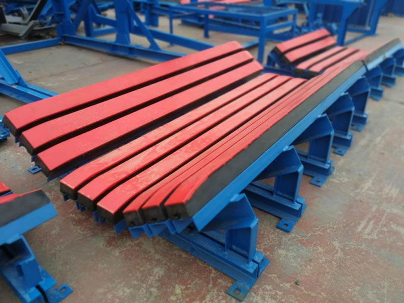 緩沖床主要用于替代緩沖托輥,緩沖床由緩沖條組成,而緩沖條主要應(yīng)用優(yōu)良的高彈性特種橡膠層充分有效吸收了物料下落時的沖擊力,大大降低了物料下落時對輸送帶的沖擊,真正的改善了落料點的受力狀況。并采用特殊的UHMW高分子聚乙烯表面,使輸送帶與緩沖條之間的摩擦系數(shù)降到最低,且耐磨性好。緩沖床的使用保證了輸送帶的面與面的接觸,受力均勻,有效防止了由于托輥斷裂、脫落造成的皮帶縱向撕裂,同時大大降低了皮帶被銳器或尖銳物料穿透后縱向撕裂的概率。